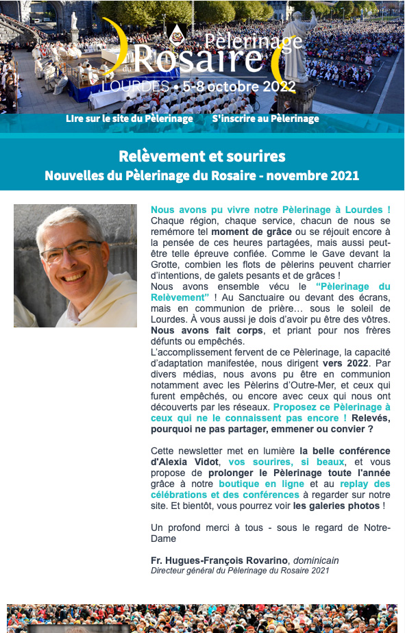 La direction générale du pèlerinage du Rosaire a conjugué ses talents avec ceux du Sanctuaire de Lourdes pour accueillir près de 12000 pèlerins du 6 au 9 octobre 2021.