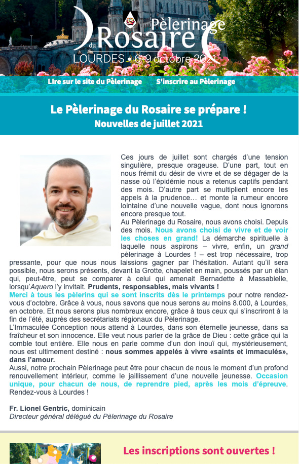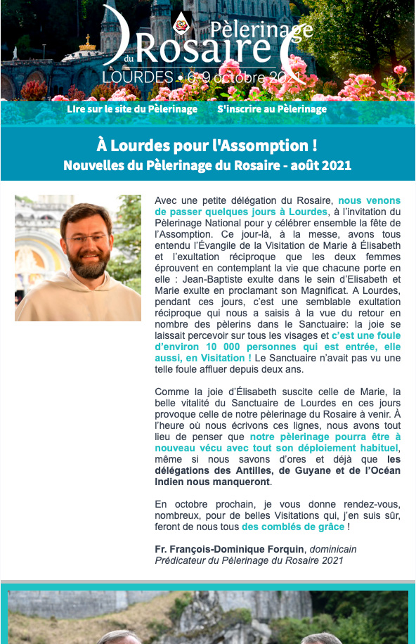 Dans les régions, les équipes s’activent pour organiser transports, hébergements et accueils des pèlerins. Ils vous attendent avec impatience. Ne tardez pas à vous renseigner et à vous inscrire. Venir au Rosaire, c’est bien, avec sa région, c’est mieux !