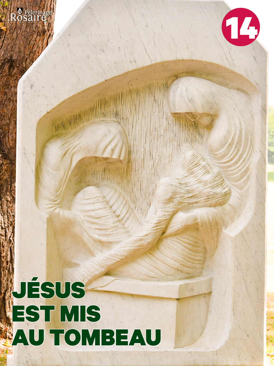 Le recueillement est intense. Une femme, un homme, tels des moines ou des moniales, le visage caché sous leur capuchon de prière, déposent le corps de Jésus dans le tombeau et de leur tristesse et de leur espérance toujours vivante. Selon la tradition, le corps et la tête sont entourés de bandelettes. Comme emmailloté dans les volutes de la tendresse, Jésus est déposé dans le tombeau des peurs et de la foi confiante.