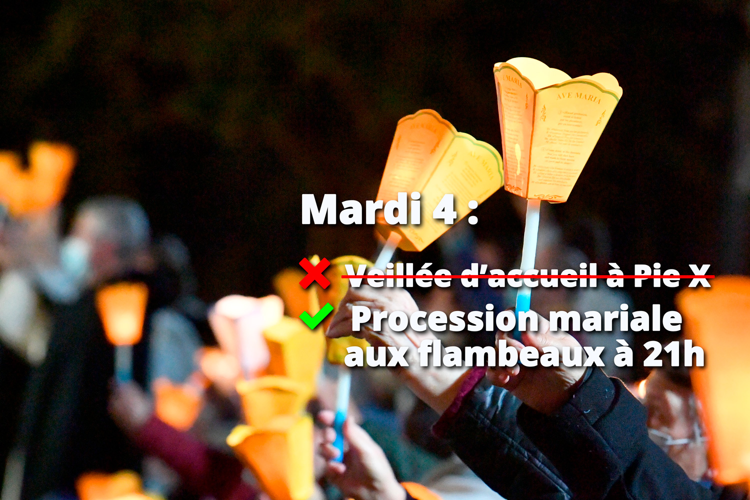Prenez votre flambeau en entrant dans le Sanctuaire et rendez-vous donc sur la prairie ou sur le chemin de la procession.