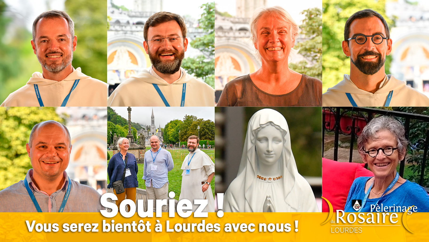 Les organisateurs du Pèlerinage du Rosaire vous attendent à Lourdes en octobre… avec leur plus beau sourire, fait pour vous ce 15 août avec derrière eux le tympan de la Basilique du Rosaire !